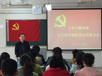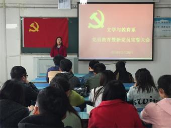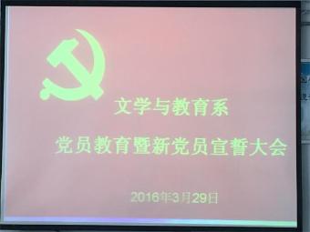 2016年3月29日中午,文学与教育系党总支在教学楼B309召开党员教育暨新党员宣誓大会,会议由系党总支秘书邵建荣主持,系党总支书记蔡友和到会指导,全体学生党员参加了会议。